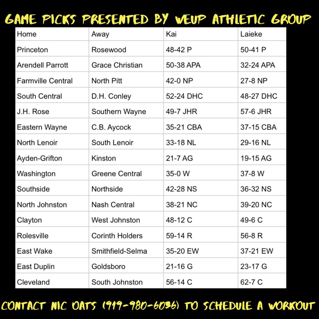 https://youtu.be/0eYSf6xkuoA Spring Creek 52, Bear Grass Charter 35 https://youtu.be/Lw1cB6JlQw0 https://youtu.be/tTrgB5KfMrk New Bern 59, Southern Wayne 0 https://youtu.be/XWcuDnD5UaA Cleveland 47, West...